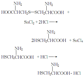 1.將胱氨酸溶于稀鹽酸中,過濾加入錫粒升溫回流。將還原液用水稀釋,移去剩余錫粒,通過硫化氫使飽和,過濾,濾渣用少量水洗,將洗液、濾液合并,減壓濃縮,冷卻結(jié)晶,干燥得鹽酸l-半胱氨酸。